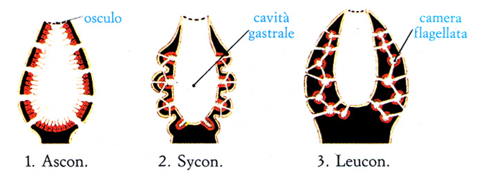 Nel tipo di spugna più semplice , l’ ascon vi è una sola cavità atriale tappezzata di coanociti; nel tipo sycon i coanociti rivestono tante piccole cavità che si affacciano nell’atrio , mentre nell’ultimo tipo più complesso, leucon, i coanociti rivestono numerosi diverticoli comunicanti con l’esterno e con la cavità atriale attraverso dei canali rispettivamente afferenti ed efferenti.